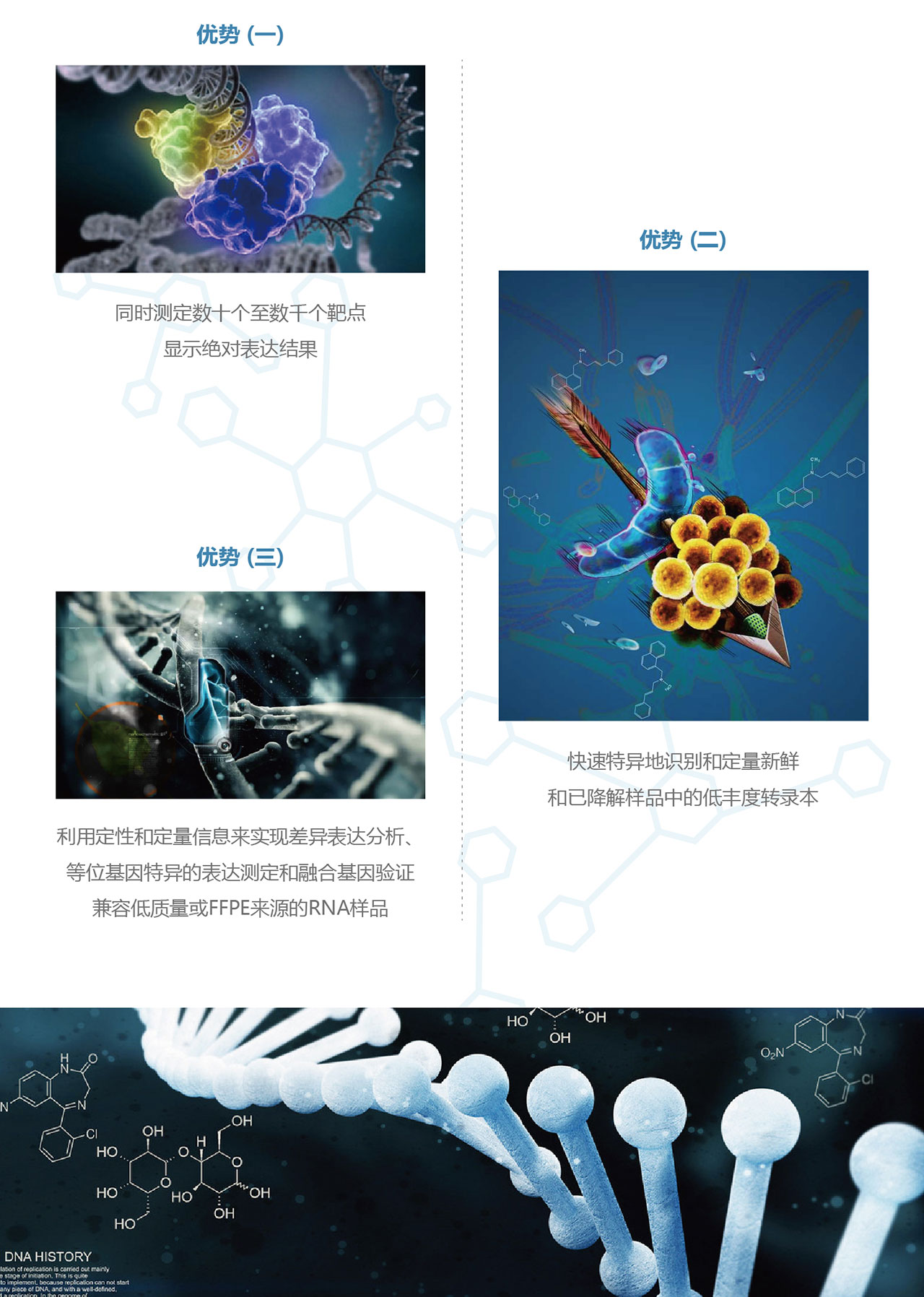 mRNA测序的主要目的是研究生物体不同的组织/细胞中,或者相同的组织/细胞在不同的状态/或者发育时期,基因表达水平的变化。由于绝大部分的mRNA都带有 poly(A)尾,因此相应使用 Oligo(dT)的磁珠可以将 mRNA从总RNA中纯化出来。已迅速成为分析疾病状况、生物过程及广泛研究设计中的转录组的首选方法.